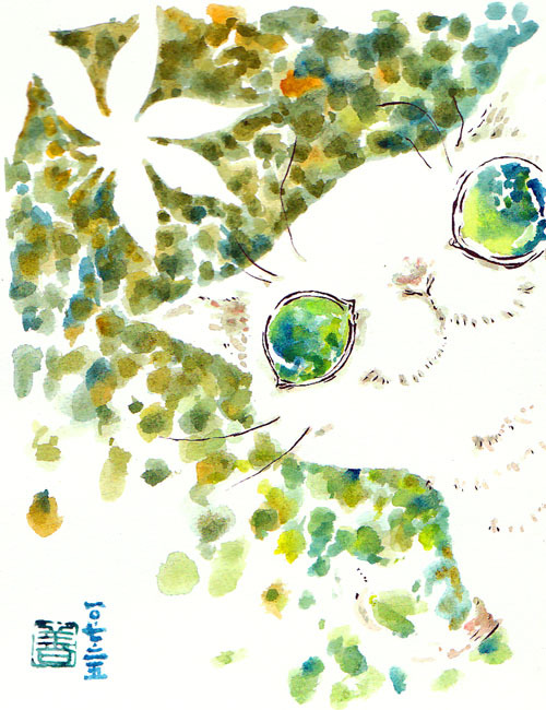 猫は右目で蜘蛛の巣を見ていた。梨の低木の、選りに選ったような細い枝に縦糸を張り、横糸をかがった上にくまなく水しぶきを被っている。午前に降った粉糠雨の名残である。巣には糸が一本垂れている。その先に小さな蟷螂がぶら下がっている。風とも呼べぬ弱い空気の震えに、蜘蛛の巣と猫のひげとは確かにゆらぐ。両者はしかも不動である。ところが蟷螂が身じろいだ。幾重もの糸に巻かれ、三角な頭を、どうか、こうか捻るたびに、いよいよ動きが狭められていくばかりである。これを吊り下げている糸は、しかし恐らく蜘蛛がこれを伝うことすら許さぬほどに細っている。蜘蛛にも乾坤にも蟷螂を渡さぬ腹であるらしい。蜘蛛の巣は水滴の一粒足りとも余さず捕らえている。蜘蛛すらも囚われている。